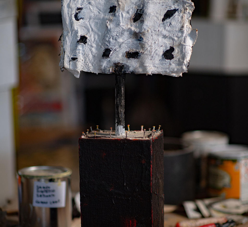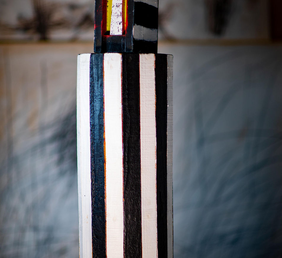 l scultura/palo l titolo dell'opera "TOTEM" 2021 l formato: 24 cm x 232 cm x 10 cm l materiale: metallo, legno, smalto l colori: bianco e nero l prezzo: Euro 1500 l