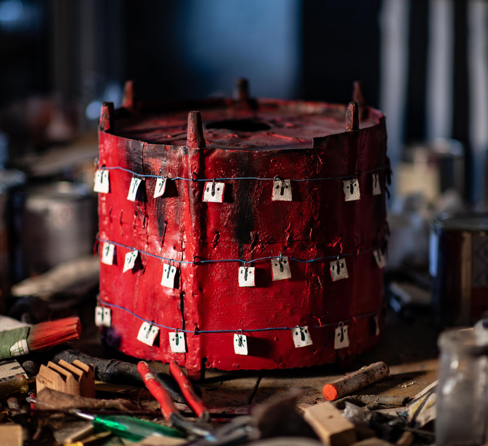 l scultura l titolo dell'opera "CISTERNA CON FIGURE" 2023 l diametro: 35 cm, alt. 31 cm l materiale: legno, metallo, smalto l colori: rosso, bianco nero l prezzo: Euro 2000 l